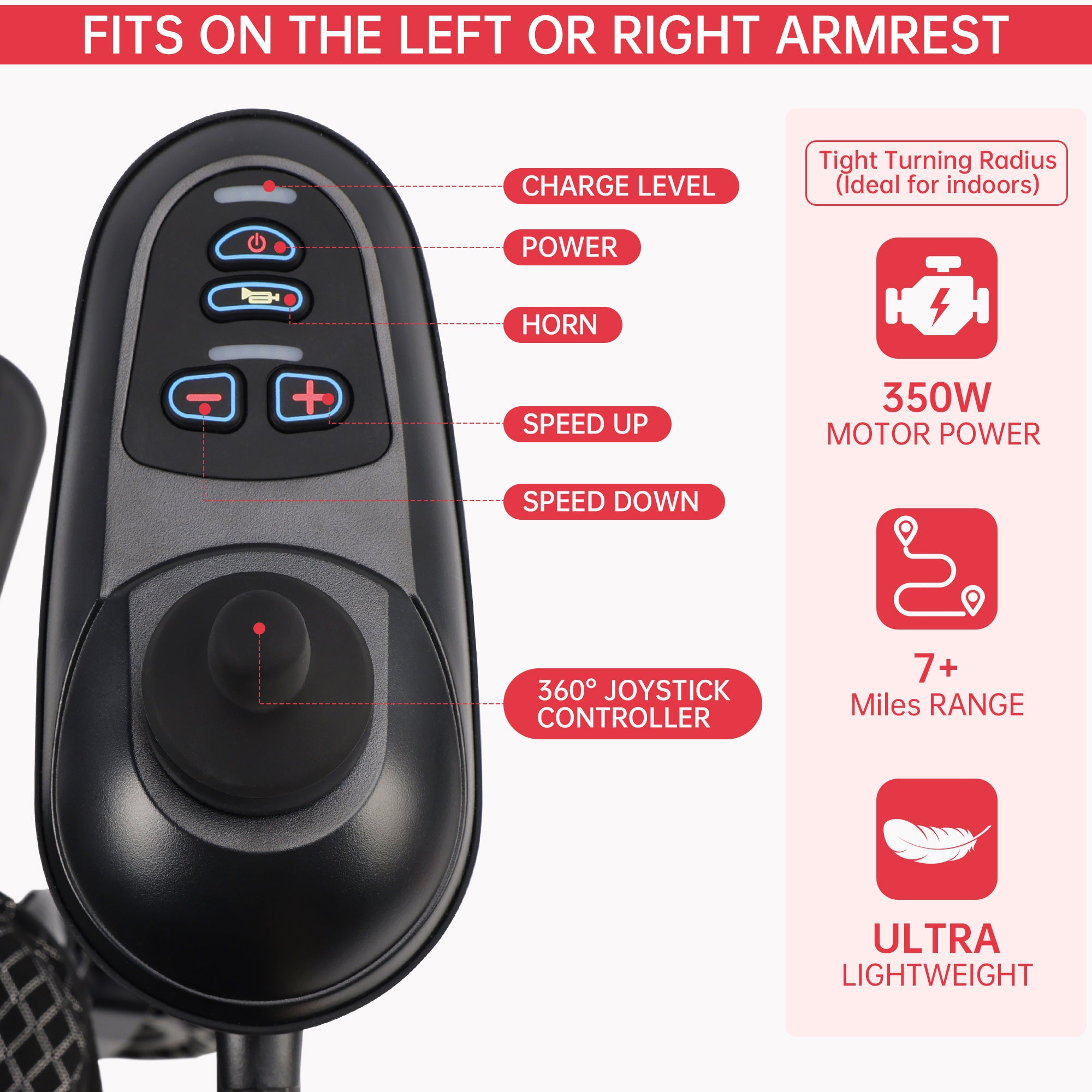 【Powerful motor is easy to use】: Combining power, efficiency and compact size, the rugged motor delivers outstanding performance on all-terrain roads, even with a 330-pound load capacity. Plus, the responsive 360 joystick makes maneuvering and braking easy, even in tight spaces.