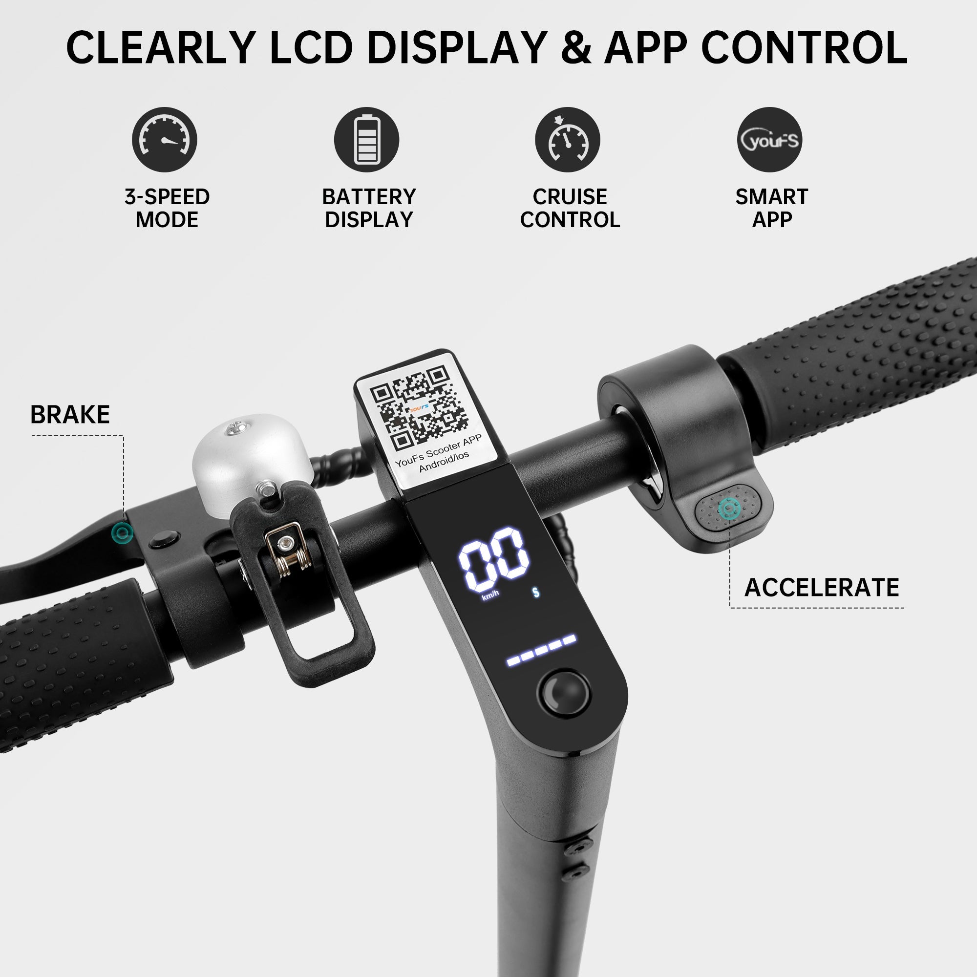 8.5" Folding Electric Scooter 350W 35KM Maximum battery life Range 30KM/H The electric scooter has stall protection,All scooter e-scooters have MSDS/FCC ect certificates, so you don't have to worry about battery charging. With a 350w brushless hub motor, Can meet most of your travel needs,environmentally friendly way to explore your city. Don't forget to sync your Bluetooth device 4: Super high speed as 30 KM/H,3 speed level(15KM/H&25KM/H&30KM/H). -TipS:You need to adjust the speed gear in the APP after connecting to the APP, or quickly press the power button twice to change the speed gear after turning it on, otherwise the default maximum speed will only be in the first gear 7: LCD display to show the scooter speed/mileage/condition. Steps to connect to APP: 1. Scan the QR code on the scooter body 2. After the vehicle is turned on, search for the device and you can connect it Specifics: Safety Standards: UL2272 Carton Size : 110*16*55 cm / 43.31*6.3*21.65 inch Protection class: IP54 Maximum climbing angle: 15° Bluetooth: yes Is it foldable: yes electric scooter with charger Charging and Storage Environment: For safety reasons, indoor charging and storage are prohibited. If indoor charging is necessary, please stay in the charging area at all times and ensure there are no flammable materials within a 3 to 6 feet radius. Note:
