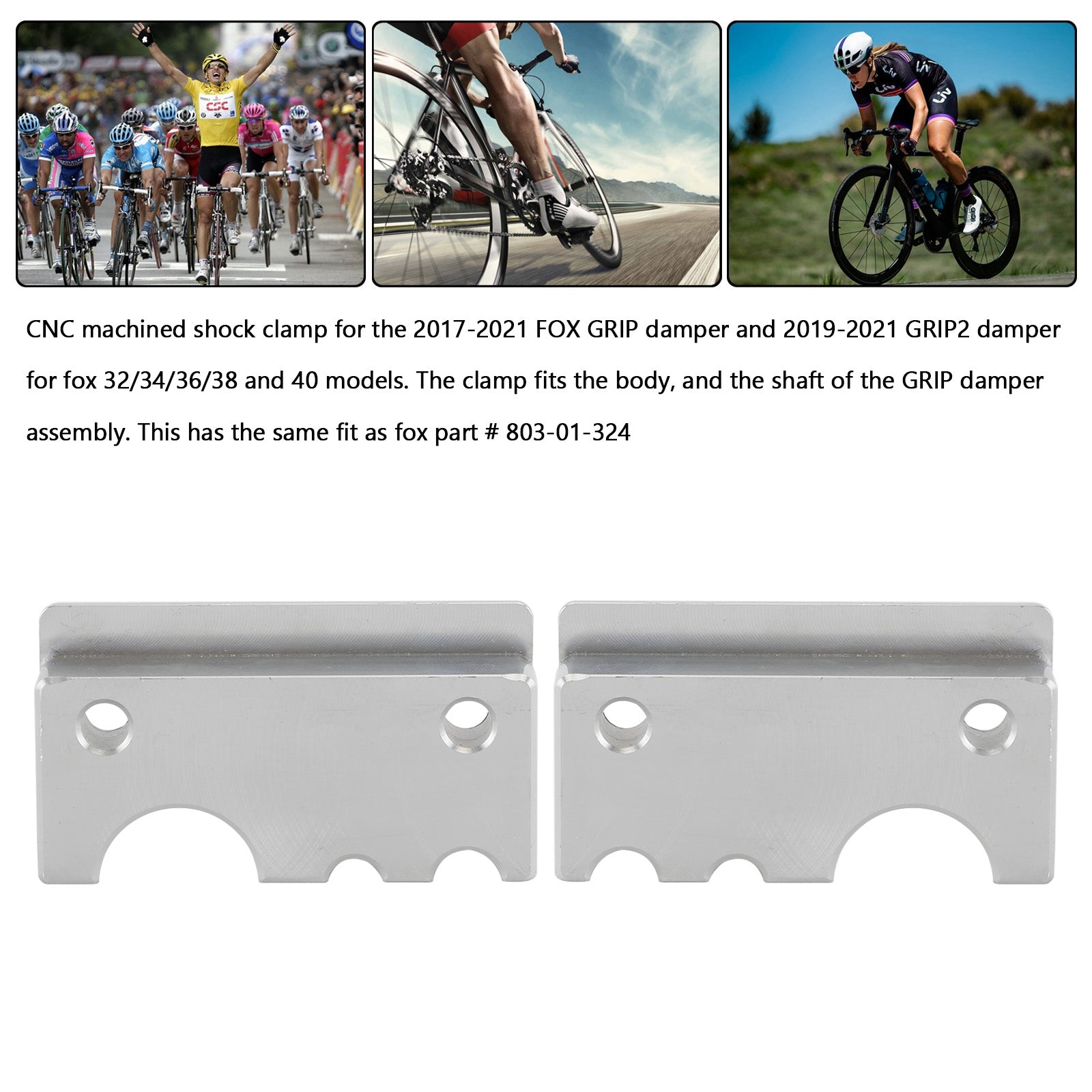 CNC machined shock clamp for the 2017-2021 FOX GRIP damper and 2019-2021 GRIP2 damper for fox 32/34/36/38 and 40 models. The clamp fits the body, and the shaft of the GRIP damper assembly. This has the same fit as fox part # 803-01-324