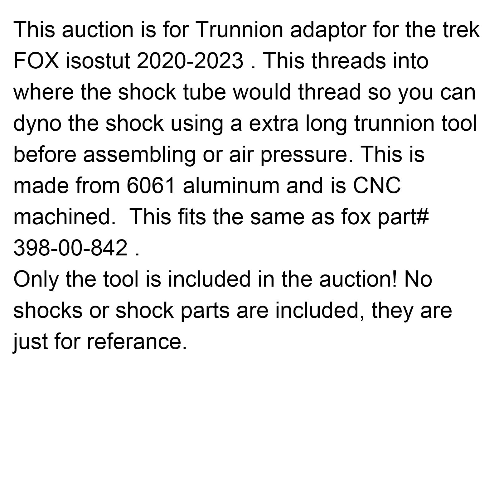 This auction is for Trunnion adaptor for the trek FOX isostut 2020-2023 . This threads into where the shock tube would thread so you can dyno the shock using a extra long trunnion tool before assembling or air pressure. This is made from 6061 aluminum and is CNC machined. This fits the same as fox part# 398-00-842 .