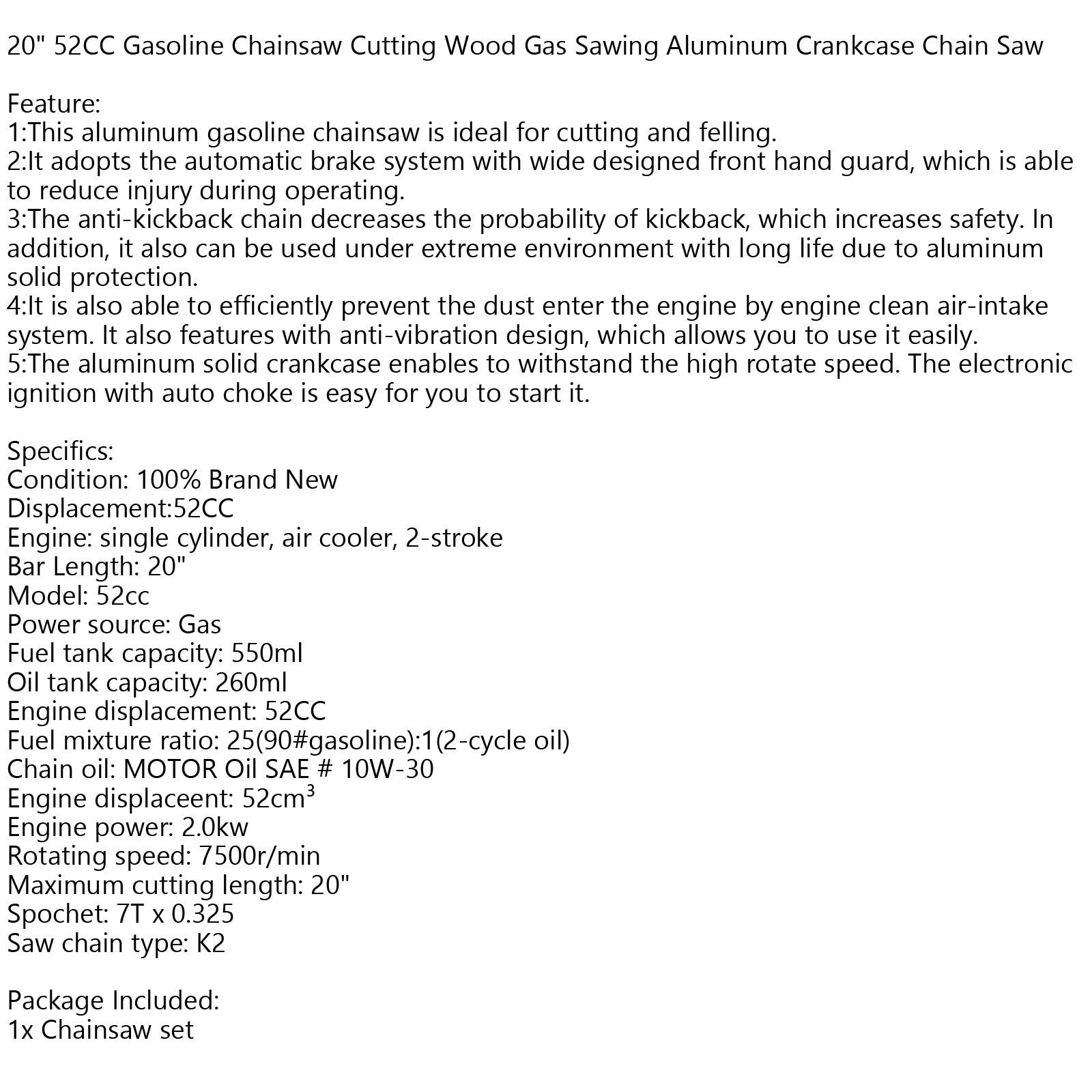 52cc 20-Inch Gas Chainsaw Bar Powered Engine 2 Cycle Gasoline Chain Saw