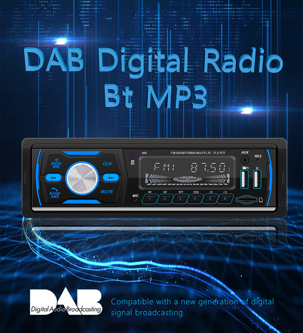 1 DIN Car Radio Bluetooth MP3 Player USB AUX FM Stereo AM RDS DAB In-dash Features: 1. Radio (FM, AM, RDS, DAB, DAB+) 2. Suppot reading TF card USB flash drive (audio) 3. AUX function 4. Bluetooth function 5. RCA audio output can be connected to a subwoofer Specification: Model: M4 Voltage: 12V Type: Car Stereo MP3 Player Configuration: DAB, DAB +, FM, AM, RDS, USB flash drive reading, USB charging, TF card reading, Bluetooth, remote control, colorful lights Software solution: Jieli CPU Screen model: LCD_VA Panel size: 188 * 58mm/7.40*2.28" Panel lighting: changing colorful lights Package size: 200 * 75 * 110mm/7.87*2.95*4.33" Depth: 60mm/2.36" Product weight: 400g Phone connectivity: No GPS navigation: No Radio band: FM, AM, RDS, DAB, DAB + Radio chip: 811 Language: No Power: 60W Working temperature: -10 ~ +60 C Reversing image: No Brake prompt function: No Steering wheel control function: No Bluetooth model: Version 5.0 Amplifier chip: TDA7388 Video output: No Screen mirroring: No Built-in offline map: No Wireless WIFI: No TF card slot: YES GPS card slot: No Remote control: silicone remote control Steering wheel remote control: No USB interface and version: USB2.0 Reset button: Yes Button: physical buttons RCA terminal introduction: 4 RCA outputs (red / white), 1 DAB antenna interface Front AUX audio input: Yes DVR function: No DAB function: Yes OBD function: No TV function: No DVD movement model: No 4G / 3G: No Car logo replacement: No Supported audio format: MP3 / WMA / WAV / FLAC Supported video format: No Supported picture format: No Factory setting password: No Note: The previously equipped DAB antenna has been changed to a built-in DAB with the same function. This Item support European high-definition broadcast DAB, fully compatible with DAB +, true digital signal. Other continent is not support DAB, but other functions can be used normally. Pakage Including: 1 * head unit 1 * power cord 1 * remote control 1 * manual 1 * tool