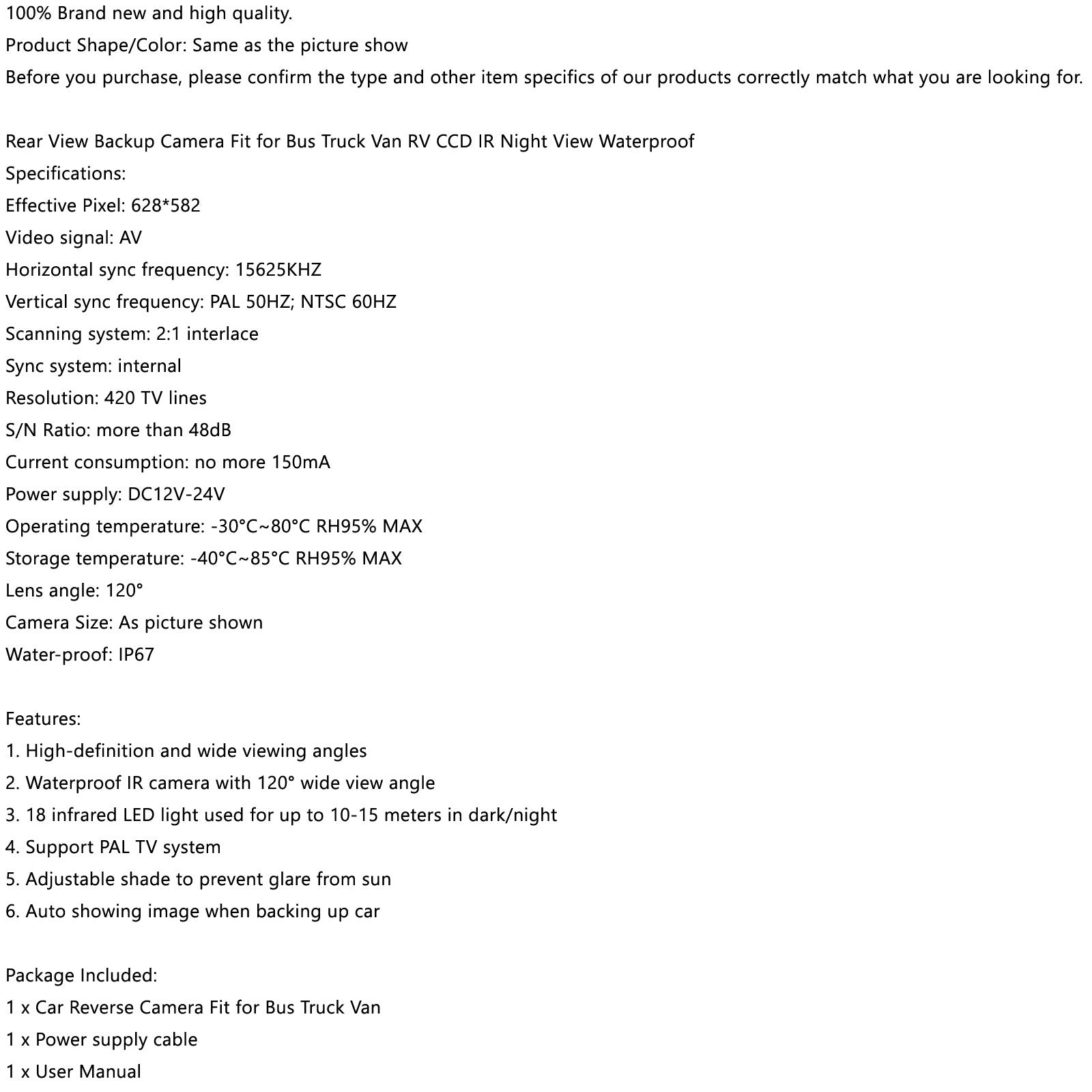 Rear View Backup Camera Fit for Bus Truck Van RV CCD IR Night View Waterproof