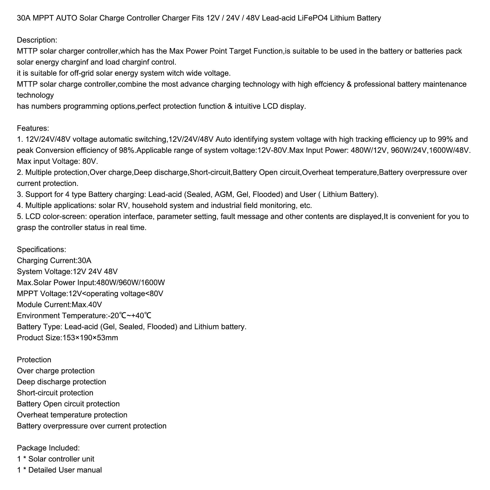 30A MPPT AUTO Solar Charge Controller Charger Fits 12V / 24V / 48V Lead-acid LiFePO4 Lithium Battery