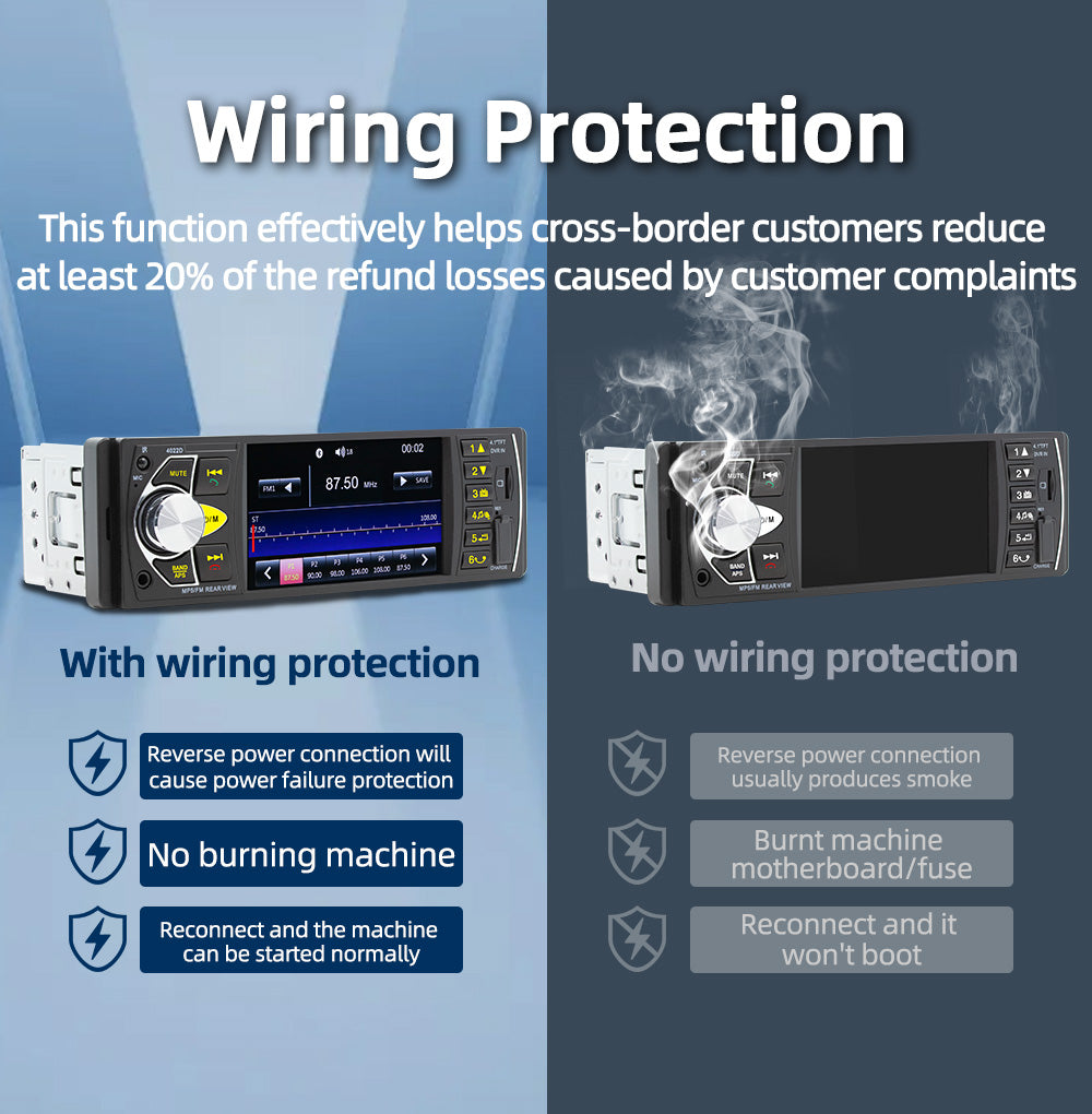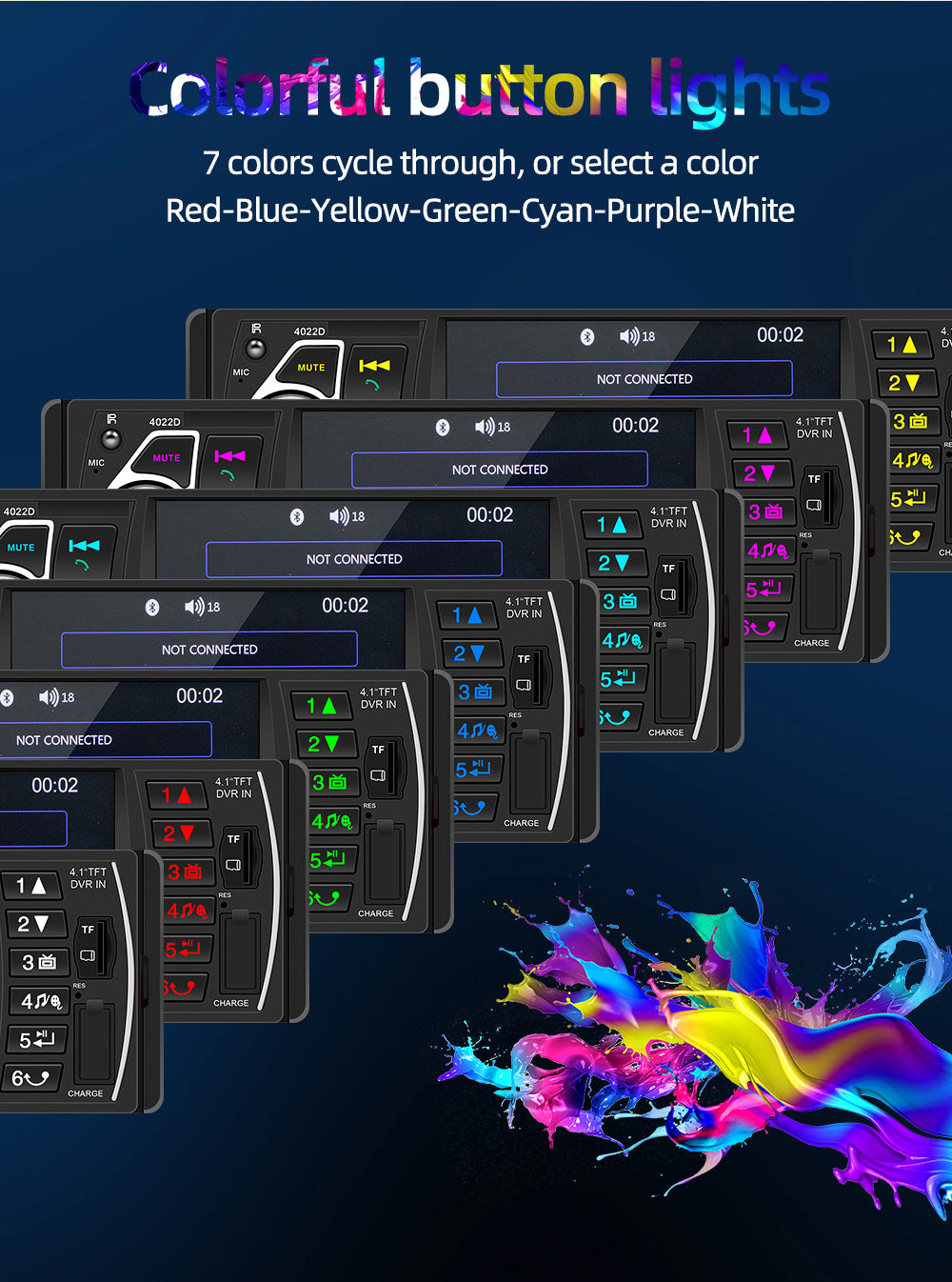 4.1 inches Car Radio Stereo 1DIN FM Bluetooth USB AUX Audio MP5 Player with 4LED Rear Camera Features: - 4.1 inch digital TFT screen - With SD / MMC card slot, with USB 2.0 port - Bluetooth 2.0, support hands-free calls - 2 way video output, 1 way audio output - Support high capacity TF card - Display song words and names - With 4 Led rear camera function,the best backup cameras eliminate dangerous blind spots. Protect your car around of kids and little pets. - 2 remote controls are powered by 2 CR 2025 button cell - Max support 32G memory card Description: System: Fit for wince Model: 4022D Size: 18.8*5.8*5.2cm Working Voltage: DC 12V-14.4V System: Allwinner WIN-CE system Screen size: 4.1-inch IPS display Screen Resolution: 800*480 Host depth: 60mm Radio frequency: FM 87.5~108.0MHz (Europe by default, can be switched to America, South America, Russia, Japan) Radio chip: QN8035 Amplifier IC: TDA1028 Reversing image: Support Steering wheel remote control: Support Video output: Support Front USB: USB2.0 TF card: Support Reset button: Support Audio output: 2 channels (left channel + right channel) Video output: 1 channel Reversing video input: 1 channel External microphone input: Support (external microphone optional) Supported audio formats: MP3/WMA/WAV/APE/FLAC Supported video formats: RM/RMVB/AVI/MP4/MKV/3GP Image Format: JPG BMP PNG Language: English/Simplified Chinese/Spanish/French/Portuguese/Russian/German/Italian/Japanese/Polish/Turkish/Czech/Hebrew/Greek Type: Car MP5 Output power: 45Wx4 Operating temperature: -20~60℃ Bluetooth version: 5.0 version (default name: SWL-BT) Note: The remote control battery (not included): CR2025 3V button cell Pakage Including: 1 * 4.1 Inch Digital Screen Car Radio 1 * Cable 1 * User manual 1 * Rear Camera 1 * 6 Meters video cable 1 * Power cord 2 * Screws