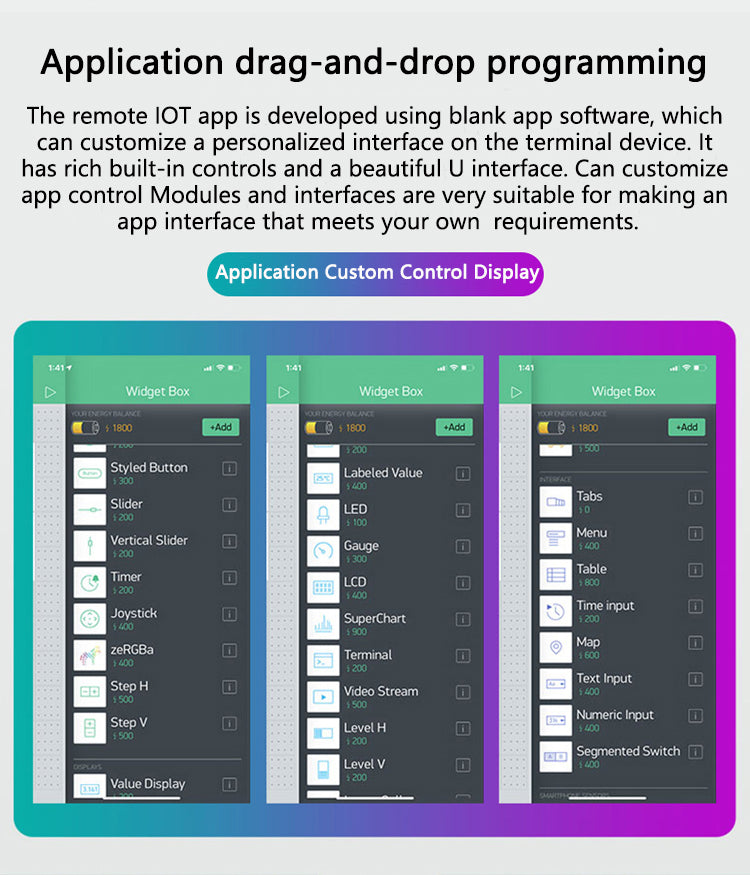 The remote IOT app is developed using blank app software, which can customize a personalized interface on the terminal device. It has rich built-in controls and a beautiful U interface. Can customize app control