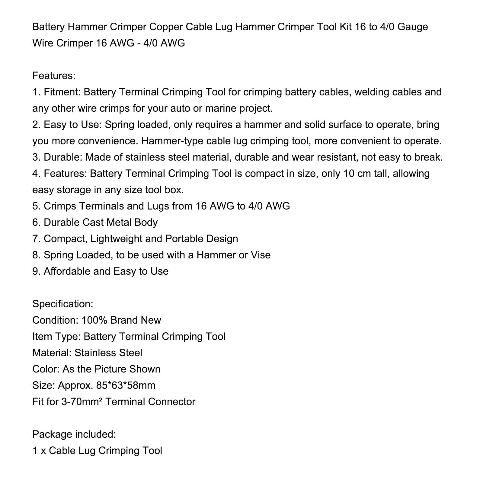 Hammer Crimper Lug Crimper Battery Cable Crimping Tool Wire 16 AWG - 4/0 AWG