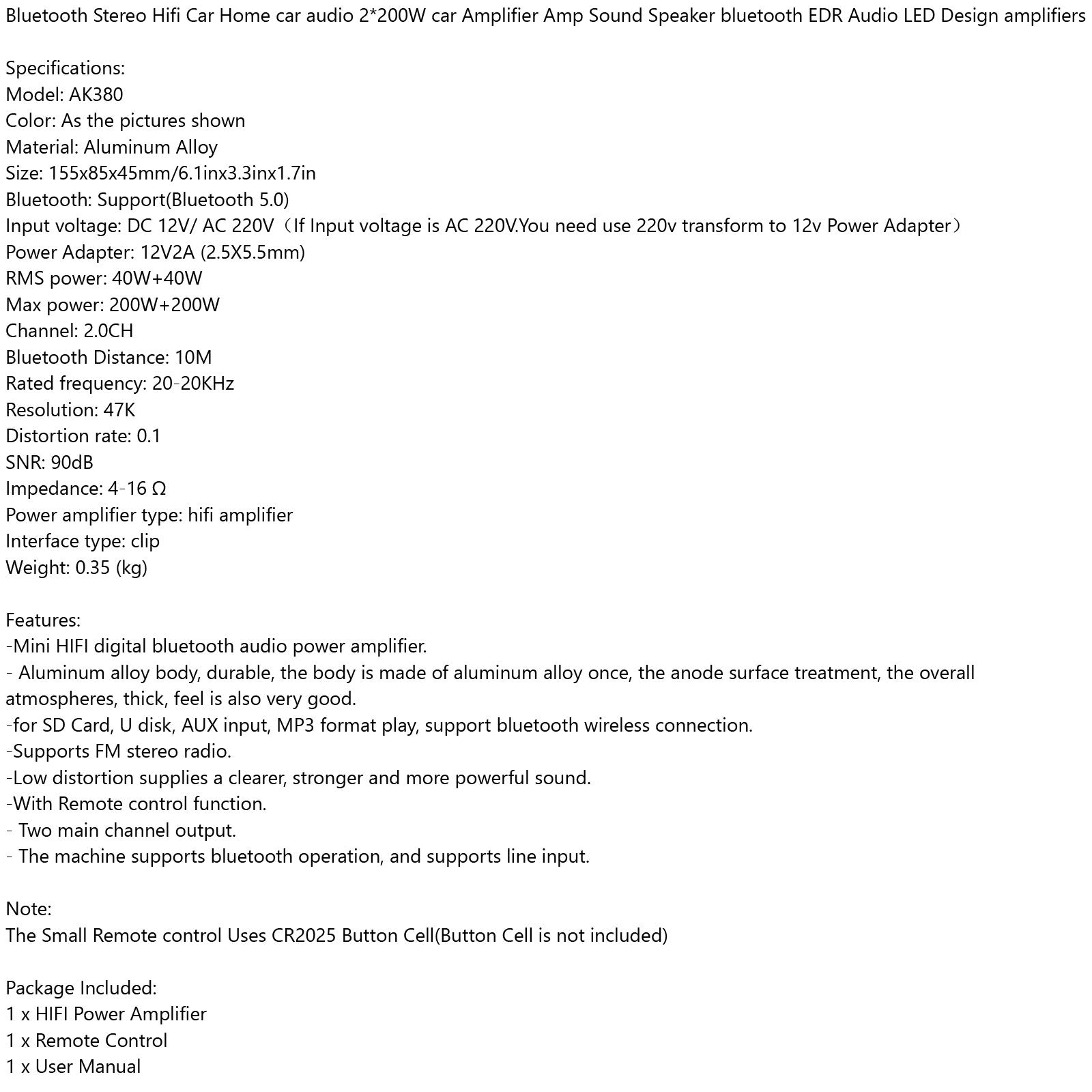 Bluetooth Stereo Hifi Car Home car audio 2*200W car Amplifier Amp Sound Speaker bluetooth EDR Audio LED Design amplifiers The Small Remote control Uses CR2025 Button Cell(Button Cell is not included) The package does not include a power cord. The power adapter specification is 12V3A (2.5X5.5mm). You can buy it yourself. If you mind, please do not bid.