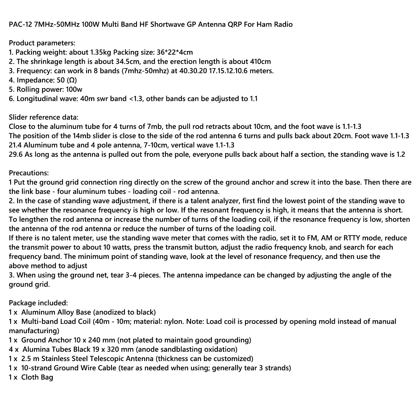 6. Longitudinal wave: 40m swr band <1.3, other bands can be adjusted to 1.1