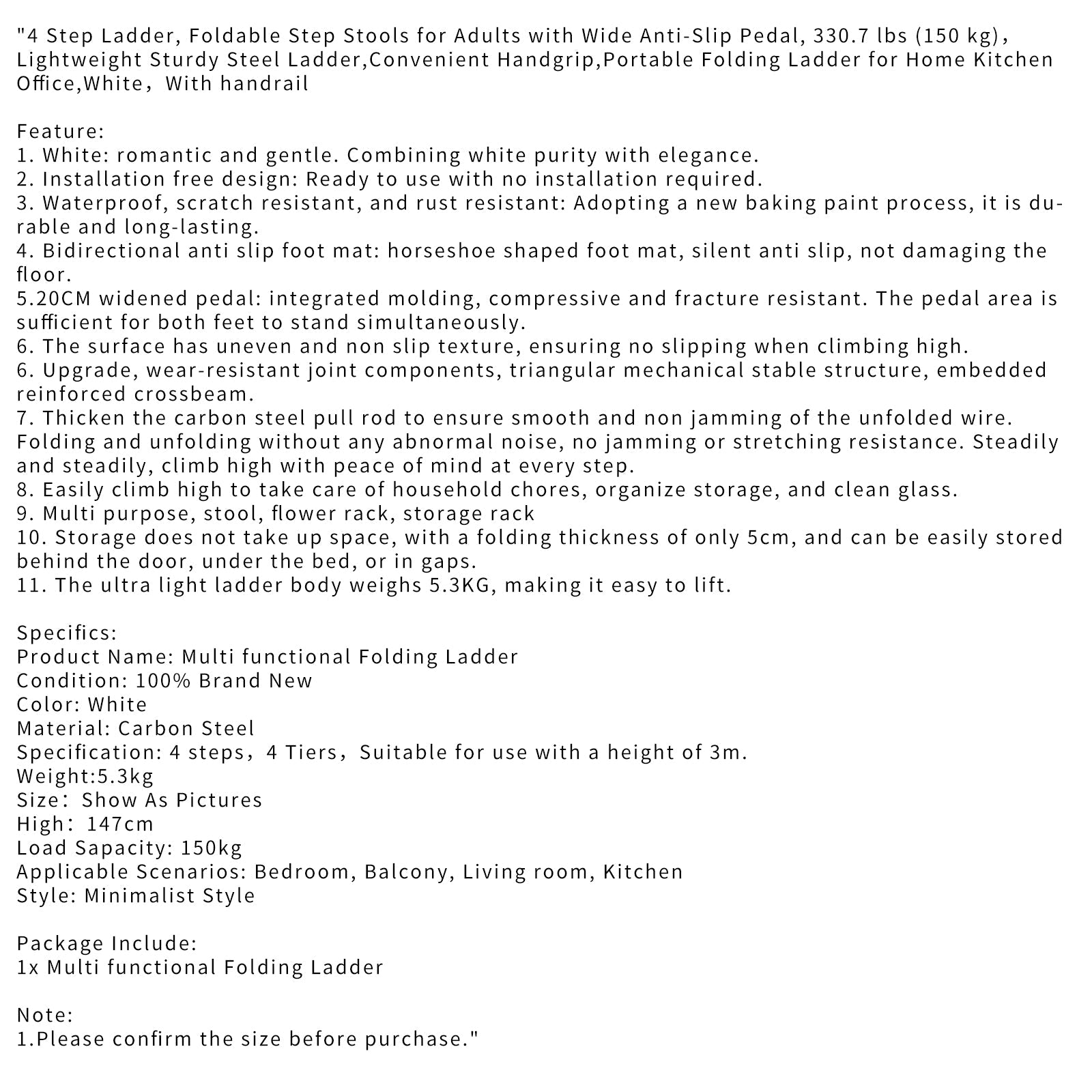 I'm very happy with this little stepladder. I ordered the 4-step version and it is exactly what we needed. fitting just right in that spot between the refrigerator and the wall. It's lightweight, perfect for older folks to carry around the house. It is also very stable when opened, and the steps are large,much larger than your typical ladder. Just a great, simple, inexpensive little stepladder for around the house. Five stars for me.