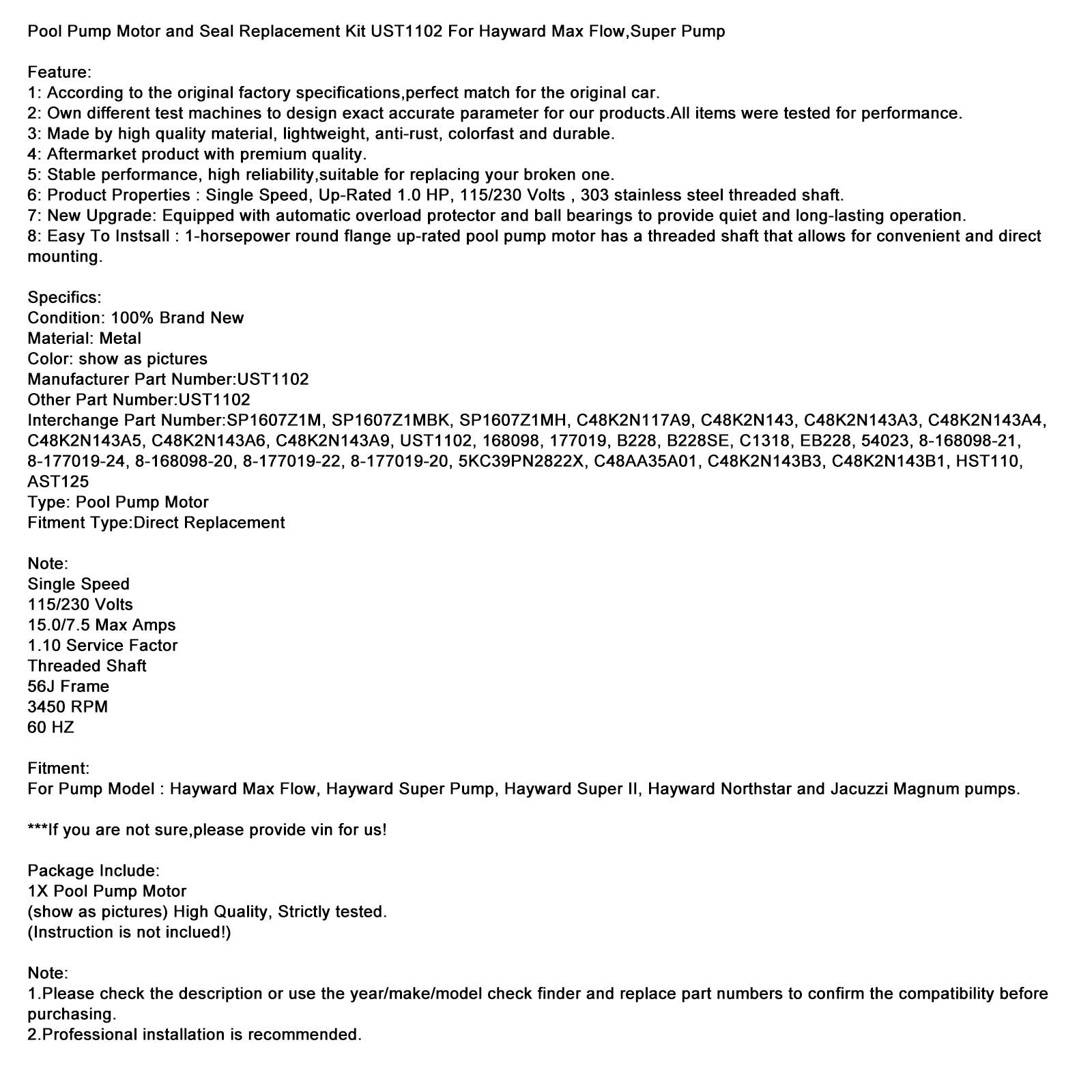 Pool Pump Motor and Seal Replacement Kit UST1102 For Hayward Max Flow,Super Pump