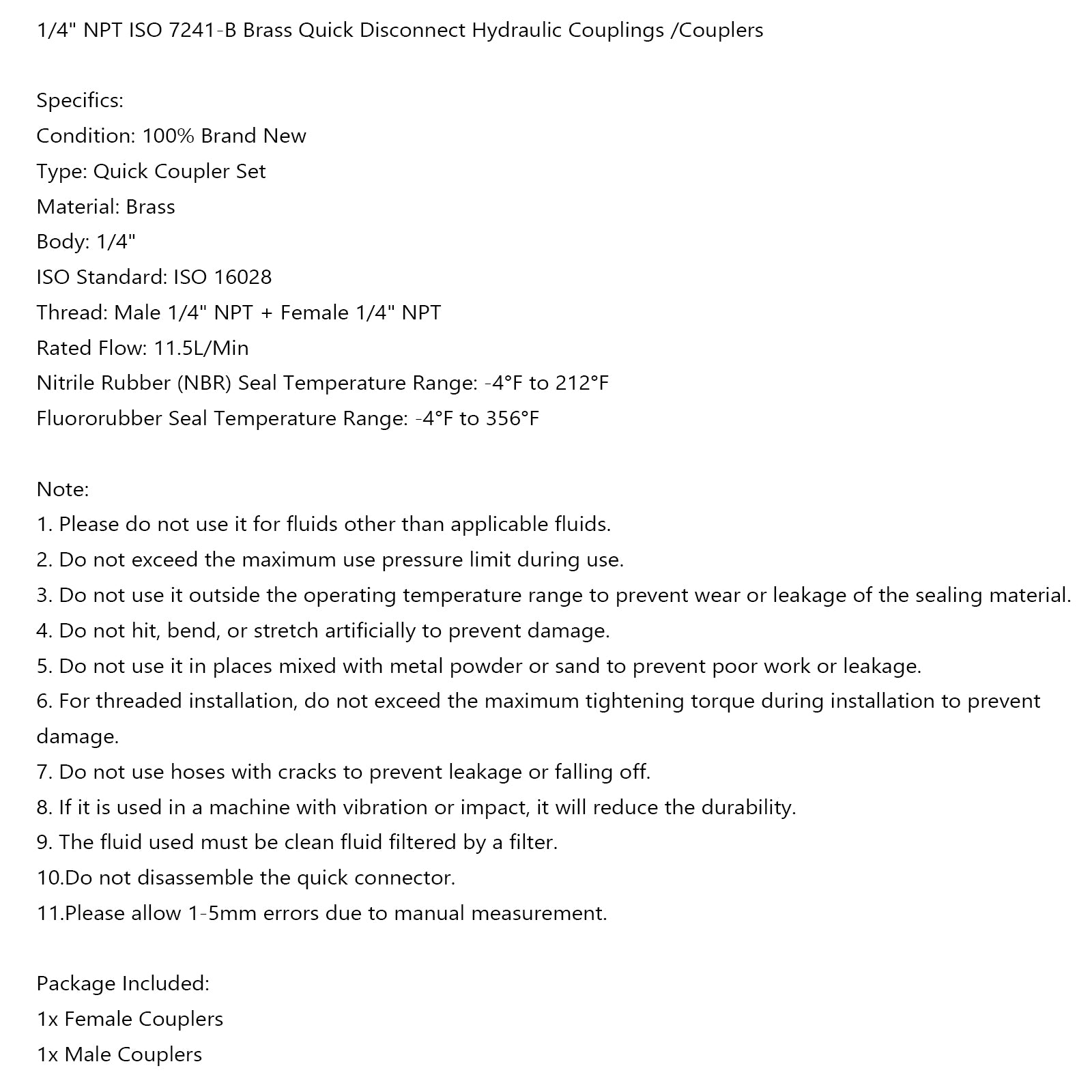 1 Sets 1/4" NPT ISO 7241-B Quick Disconnect Hydraulic Couplings/Couplers Brass