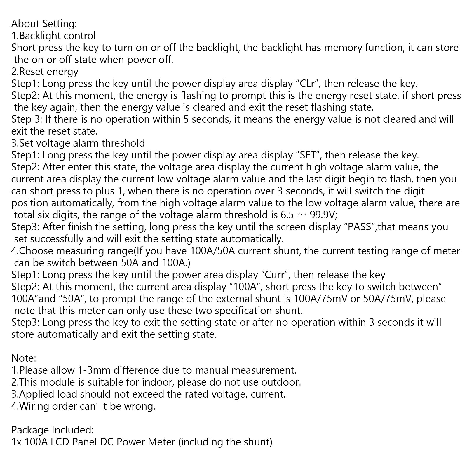 Current Measuring Range: DC 0 ~ 100A(Max. Power 10kW)