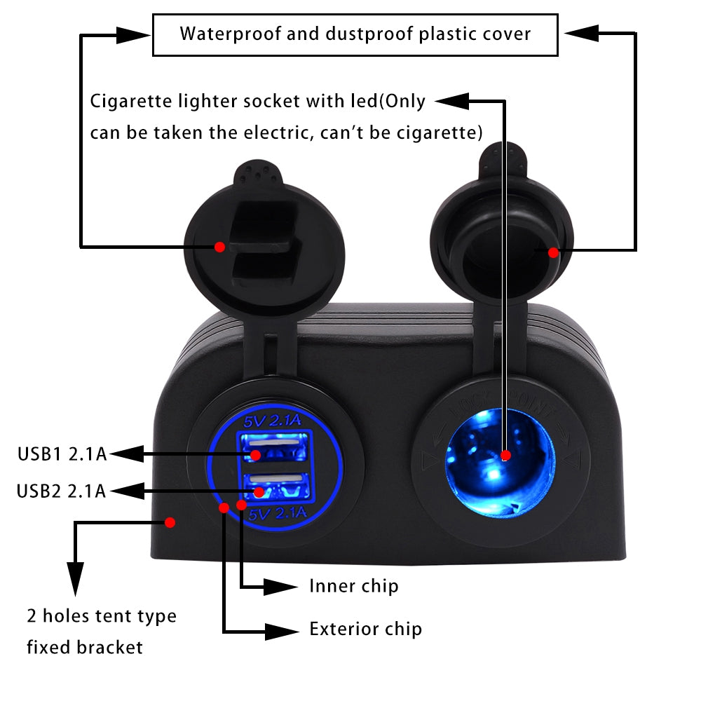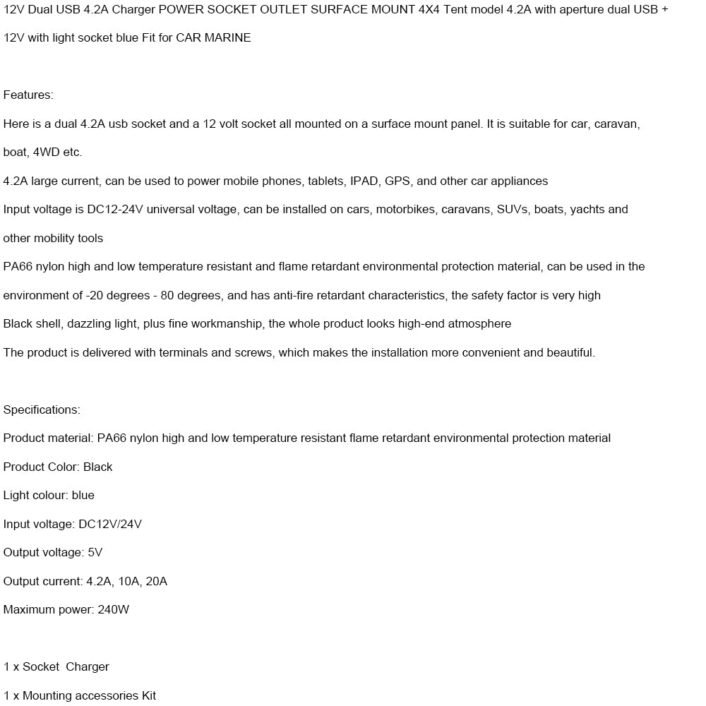 12V Dual USB 4.2A Charger POWER SOCKET OUTLET SURFACE MOUNT 4X4 Tent model 4.2A with aperture dual USB + 12V with light socket blue Fit for CAR MARINE