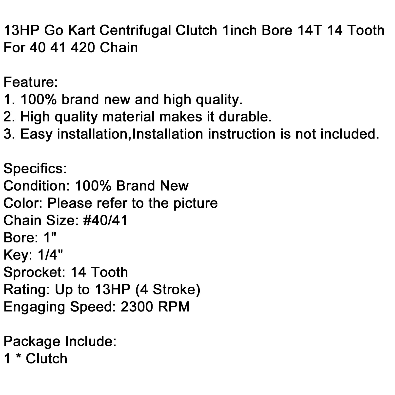 5. [COMPATIBILITY]: Fits 13hp go kart centrifugal clutch 1inch bore 14t 14 tooth for 40 41 420 chain mx.
