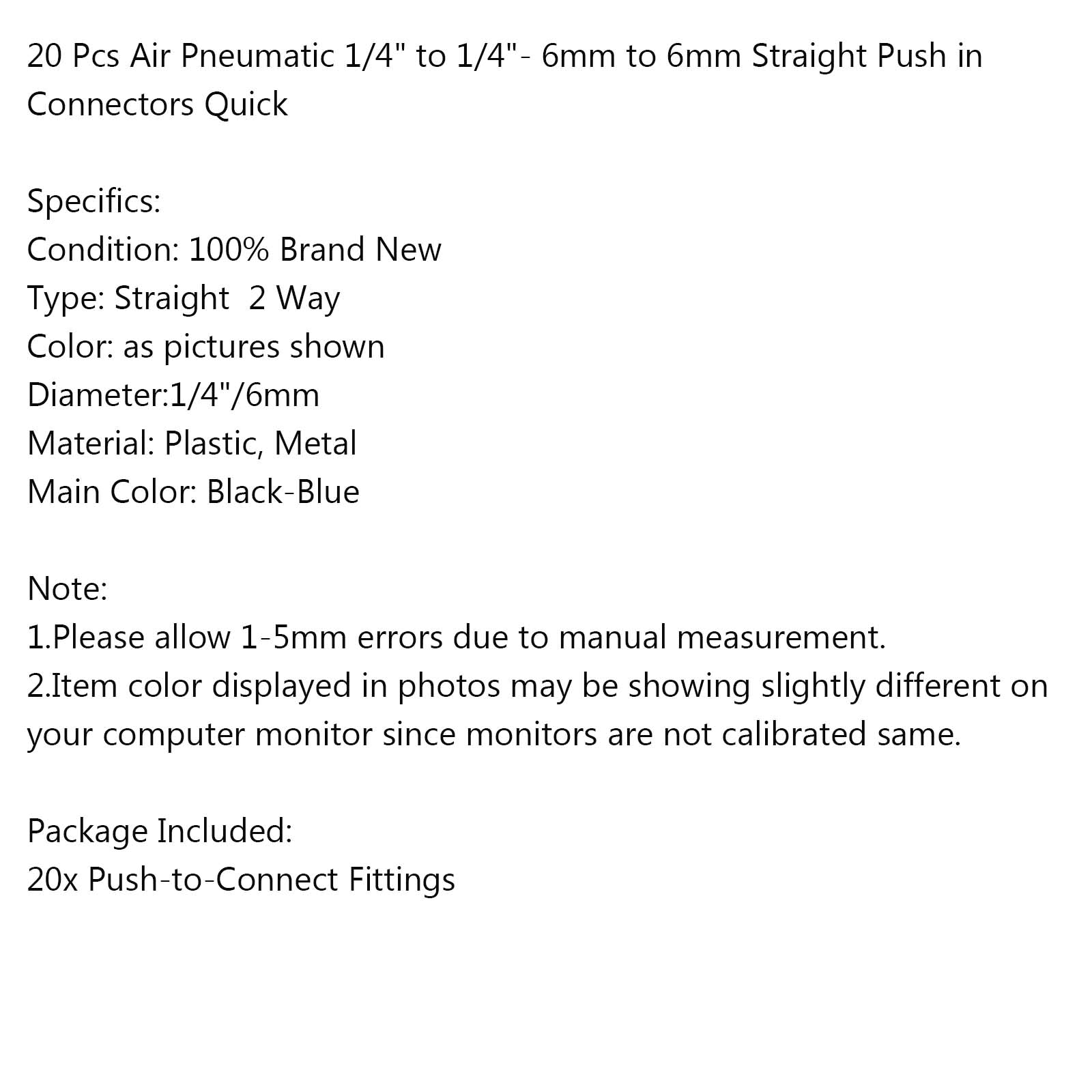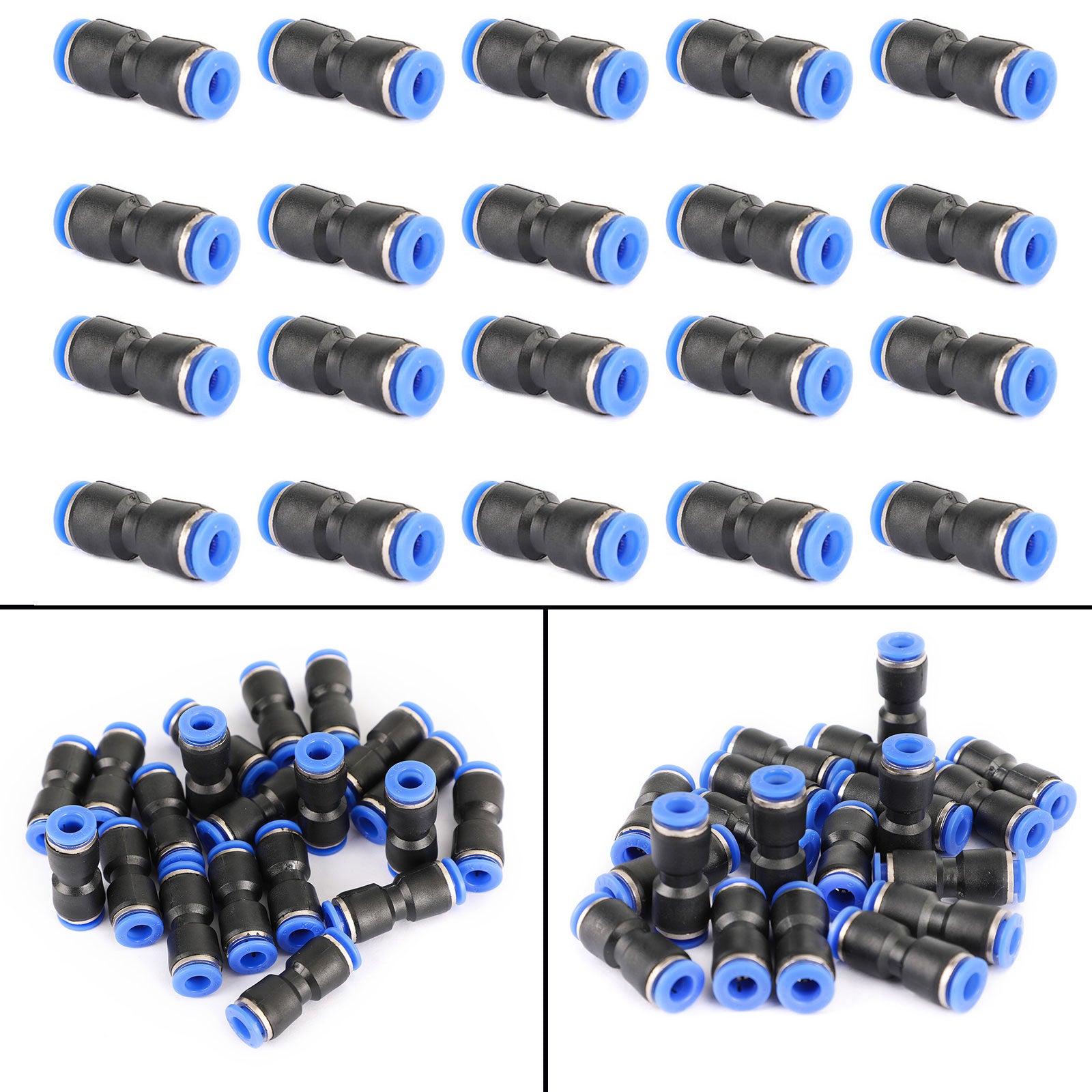 20 Pcs Air Pneumatic 1/4" to 1/4"- 6mm to 6mm Straight Push in Connectors Quick