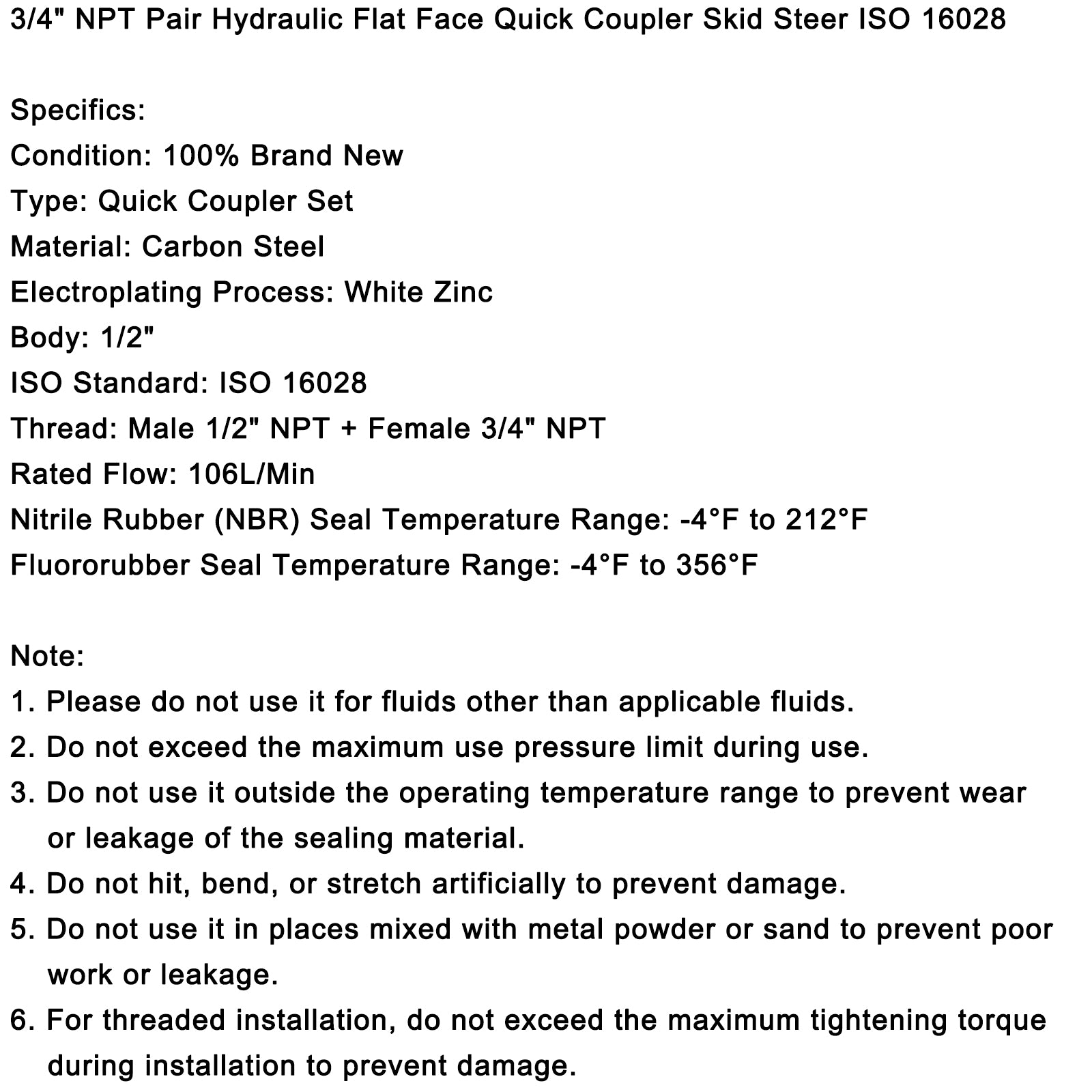3/4" NPT Pair Hydraulic Flat Face Quick Coupler Skid Steer ISO 16028