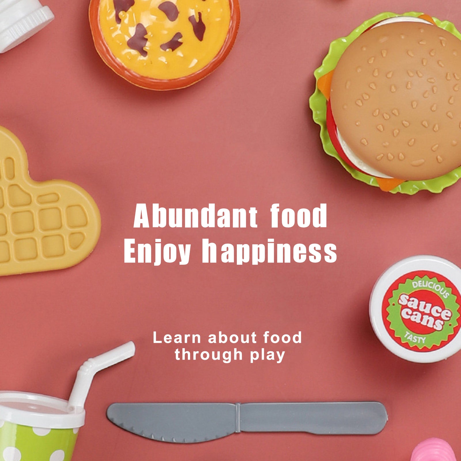 2.American Fast Food Toys: A rich variety of realistic fast food playset that includes an American style hamburger, a sturdy tray, a mouthwatering hot dog, tasty desserts, heart-shaped waffles, tomato ketchup, French fries, fresh fruits, cutleries, and more!