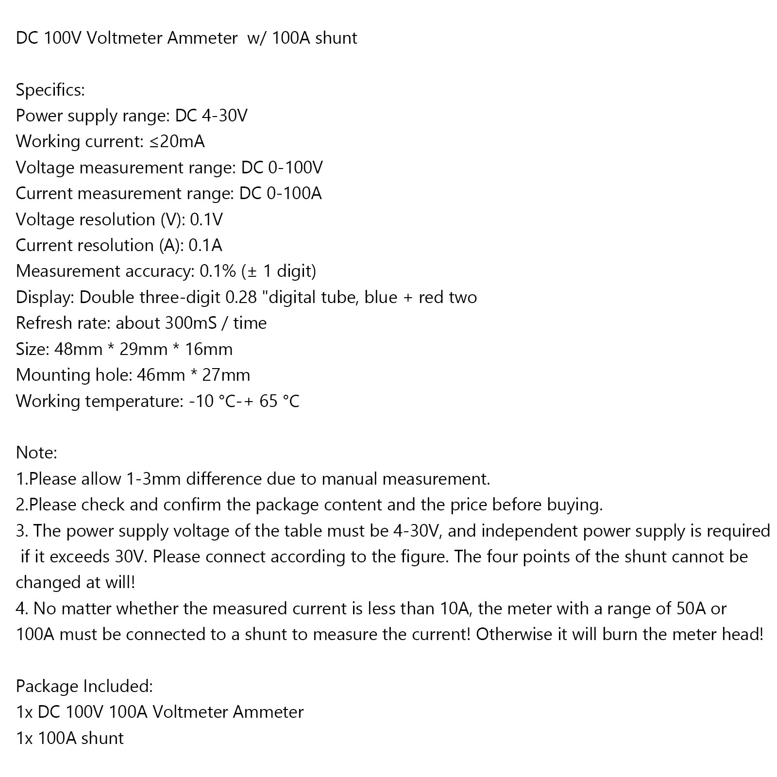 DC 100A 100V Digital Amp Volt Meter Voltmeter Ammeter Blue Red LED Current Shunt