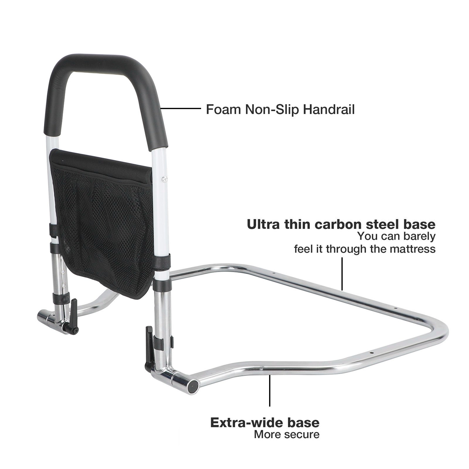 (4). Home bed rails are made from heavy duty powder coated carbon steel pipe for dependable support. Ultra-thin base, does not affect sleep.