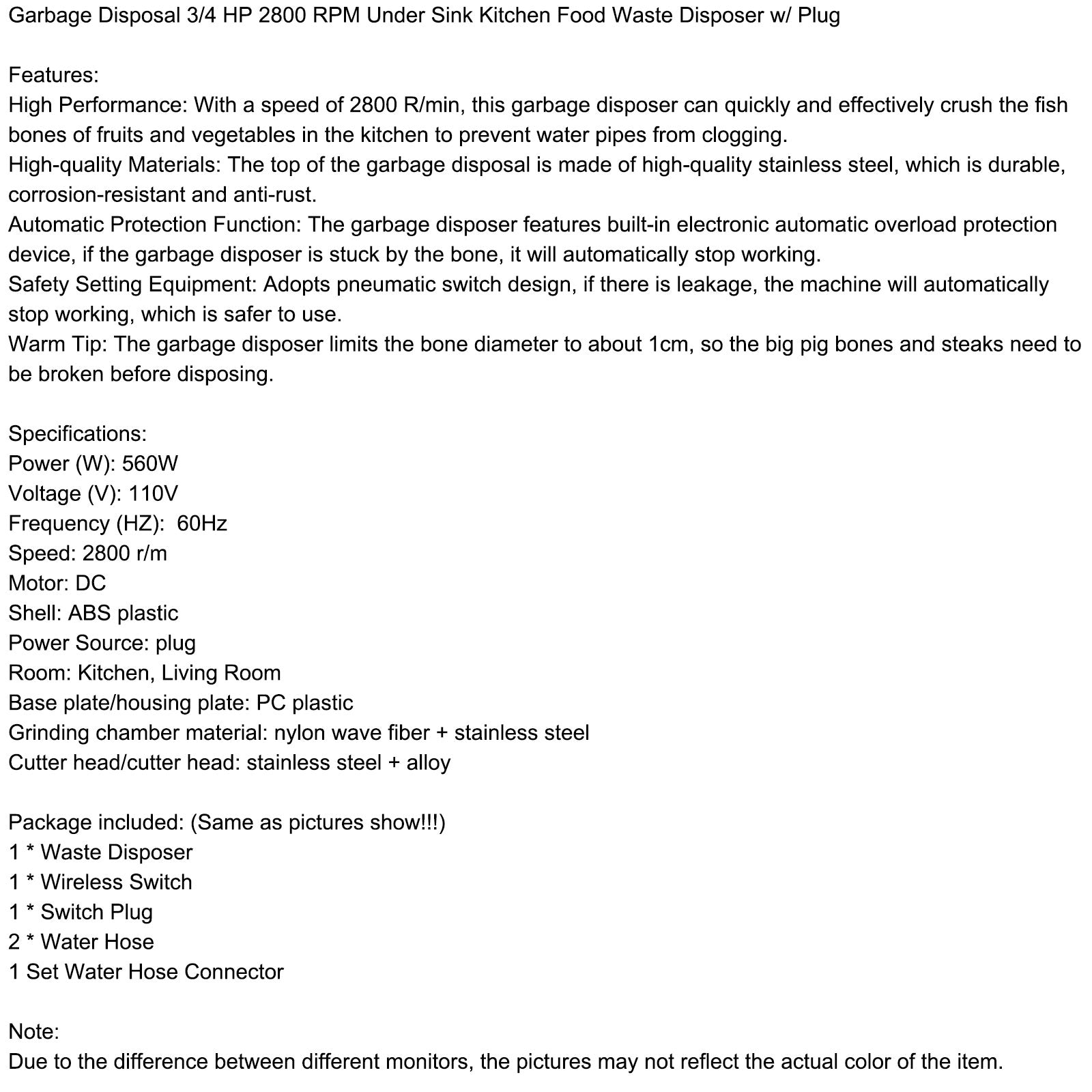 Garbage Disposal 3/4 HP 2800 RPM Under Sink Kitchen Food Waste Disposer w/ Plug