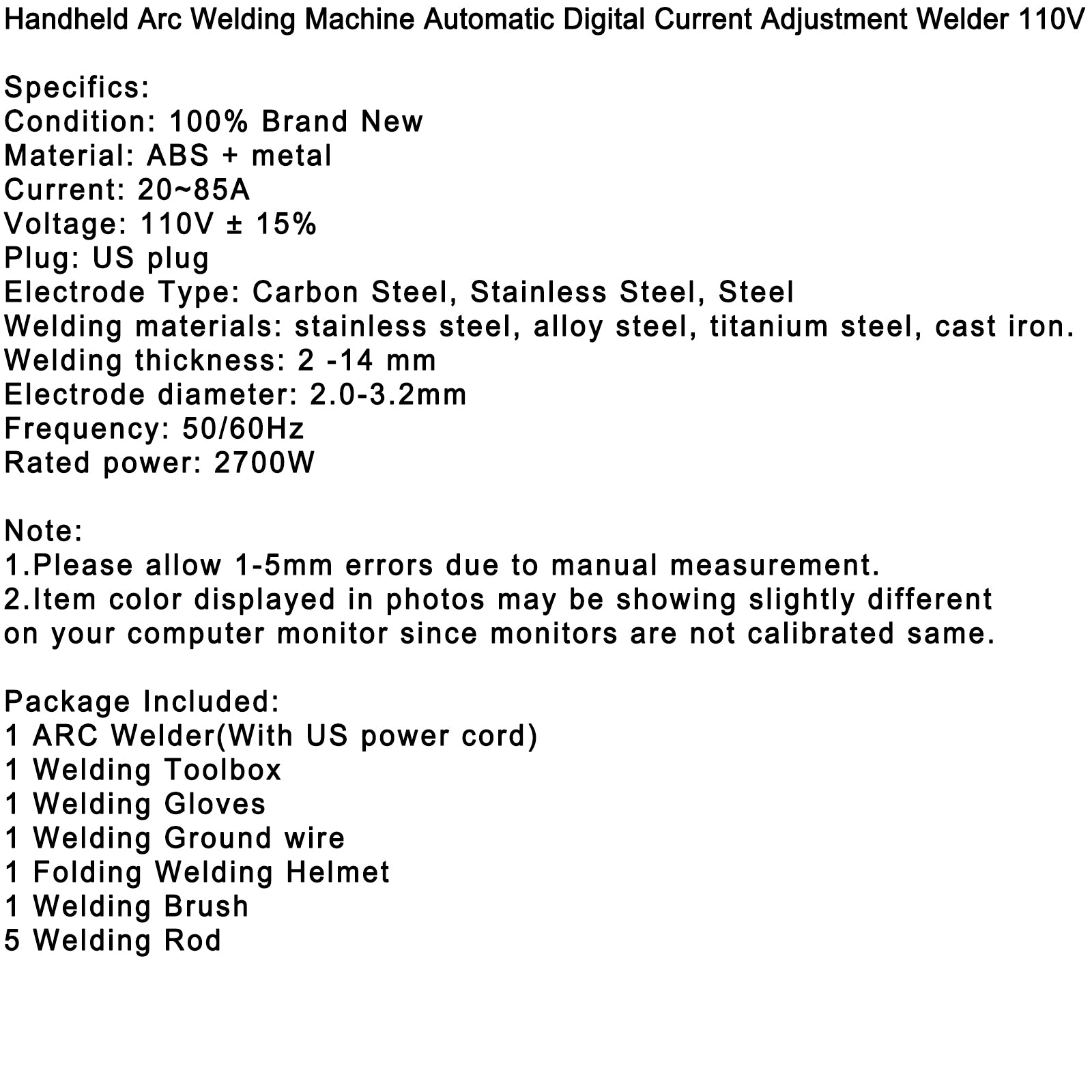 Handheld Arc Welding Machine Automatic Digital Current Adjustment Welder 110V